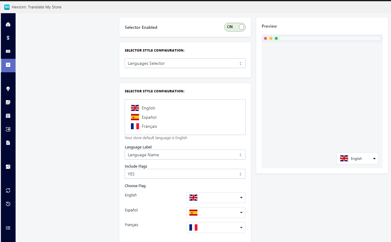 Activate the selector and adjust it according to your preferences (with or without flags, floating, in different parts of the screen, with the name of the language…). On the right-hand side, you will be able to see a preview. Once you are happy with the configuration, save the changes.