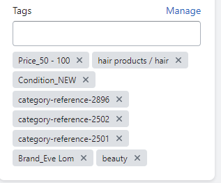 As noted in the Shopify article “Create and use tags in Shopify,” tags are very useful for grouping, organising, or filtering products within the store.