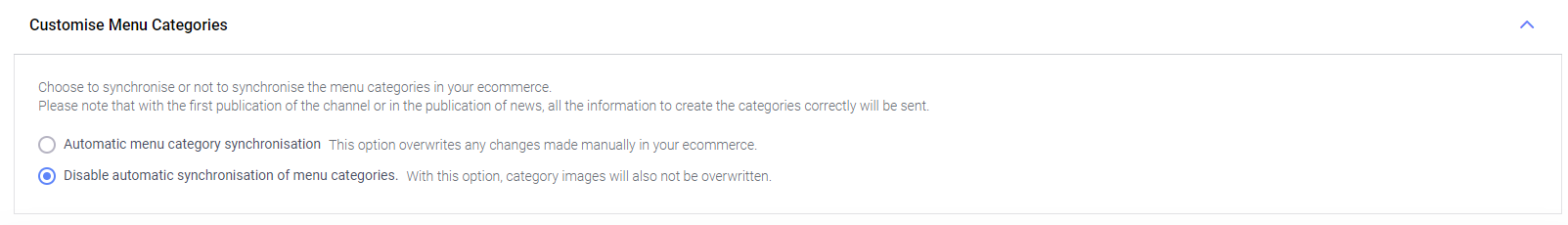 - In the Multi-Channel Integration Platform in the Catalogue management > Additional Configuration, select the option Disable automatic synchronisation of menu categories.