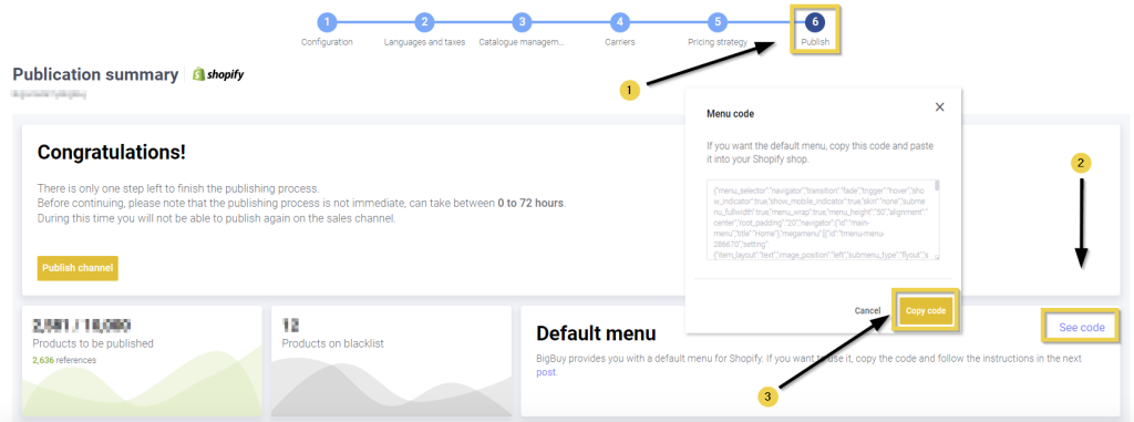 Once the app is installed, proceed to add the main menu to your store. To do this, go to the last configuration step in your MIP. There, you will find a code that includes all the categories and subcategories you have selected in the Catalogue management step.