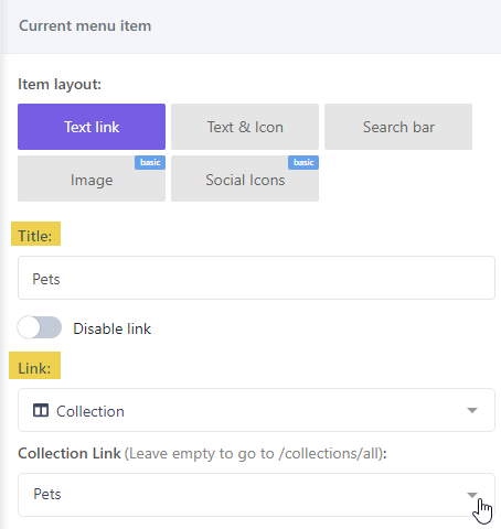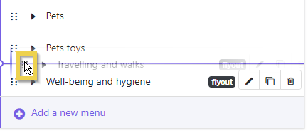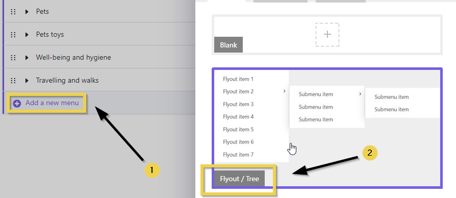 To add a new menu category, click on the “Add a new menu” link and select one of the available options. We recommend using the “Flyout” format to link a main category and add subcategories. You only need to choose a name and link it to an existing category (collection).