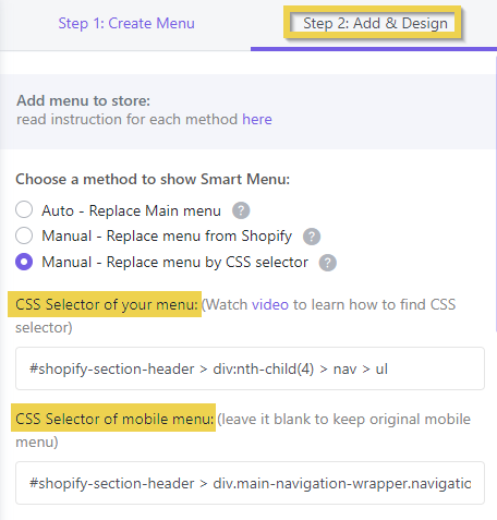 If you have a 360º shop and one of our themes, we recommend that you make no changes to this field to ensure that the menu appears as it should in your 360º shop, both in the desktop and mobile version: (Step 2: Add & Design > Method to show Smart Menu > CSS Selector).