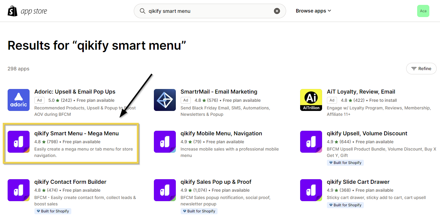 1.  Go to the “Apps” section in your Shopify dashboard. In the search field, type “Qikify Smart Menu” and press “Enter.”