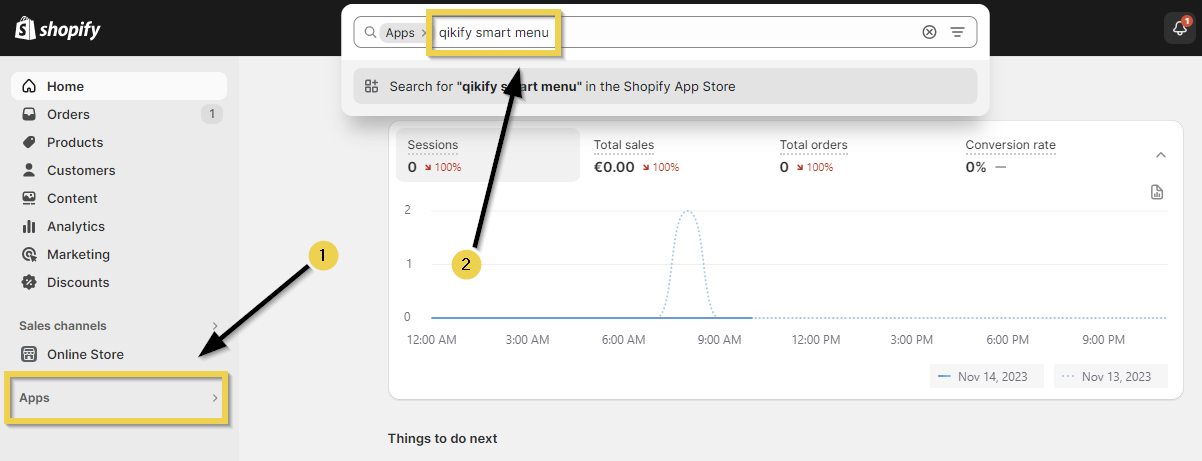 To modify the main store menu, you need to access the store’s admin panel > Apps (1) and look for the “Qikify Smart Menu” app (2). Click on the app to access it.