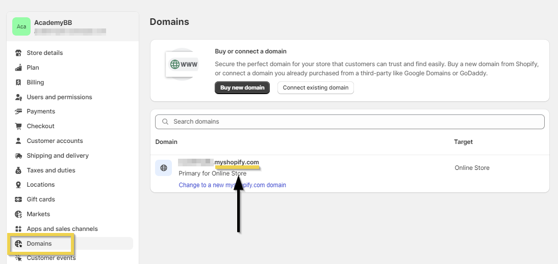 Before you get started, make sure you have your store’s Shopify URL handy. If you don’t know where to find it, you can check it directly within Shopify, in settings > domains: