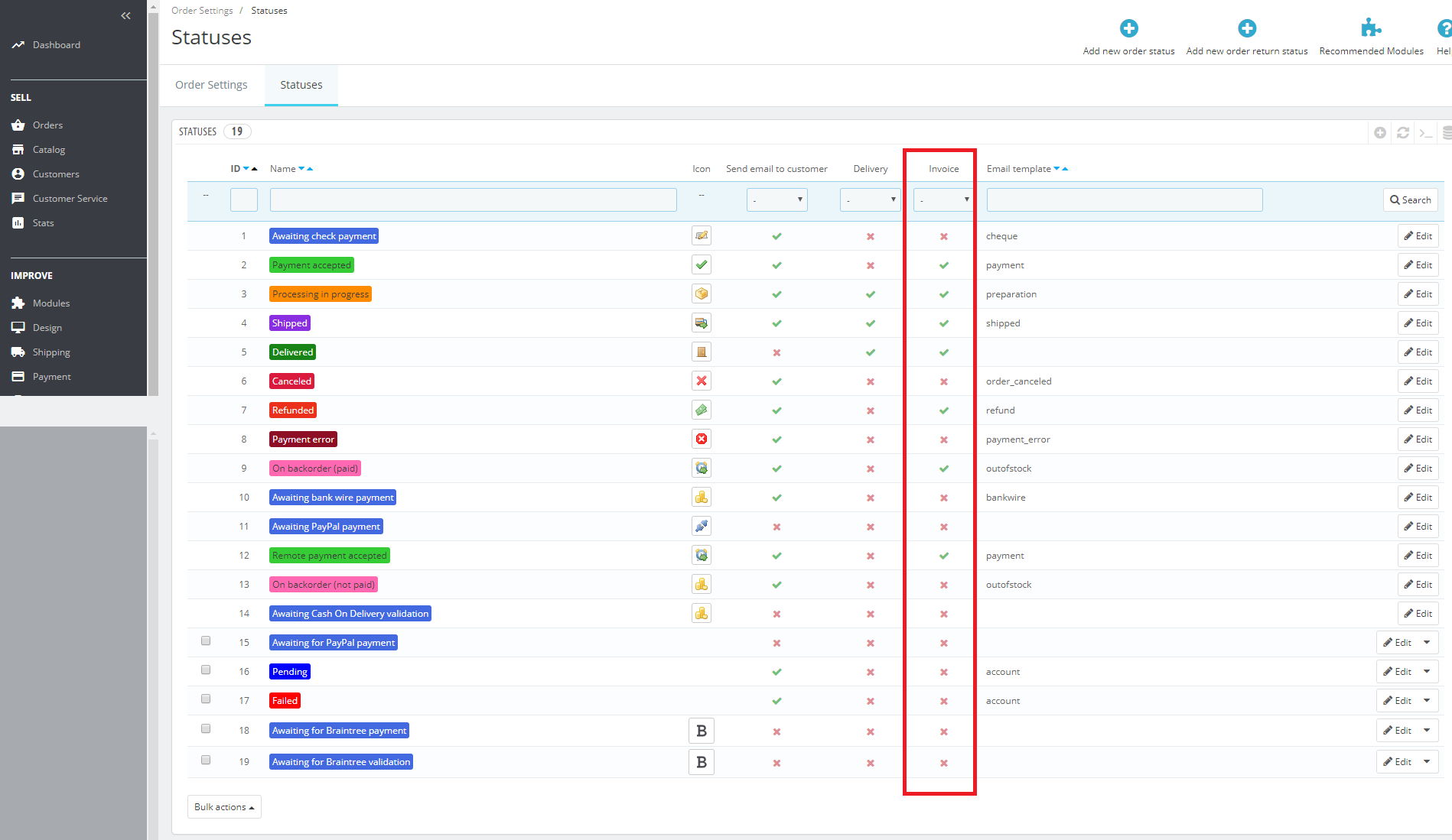 On the “Statuses” tab, you will find a list of all the possible order statuses and a column indicating whether the order status generates an invoice or not.