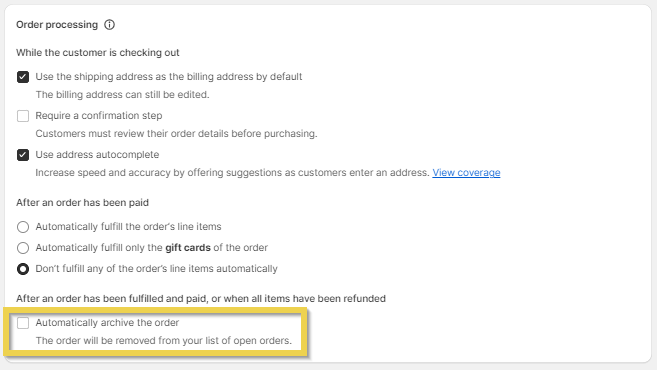 Within the Settings > General menu, keep the options as they are displayed in the image so that the orders are not fulfilled or archived automatically.