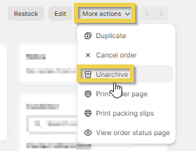 Click on the order you want to unarchive and then click on More actions > Unarchive, as shown in the picture. Once the order is saved in this status, the order will automatically be transferred to the Multi-Channel Integration Platform.