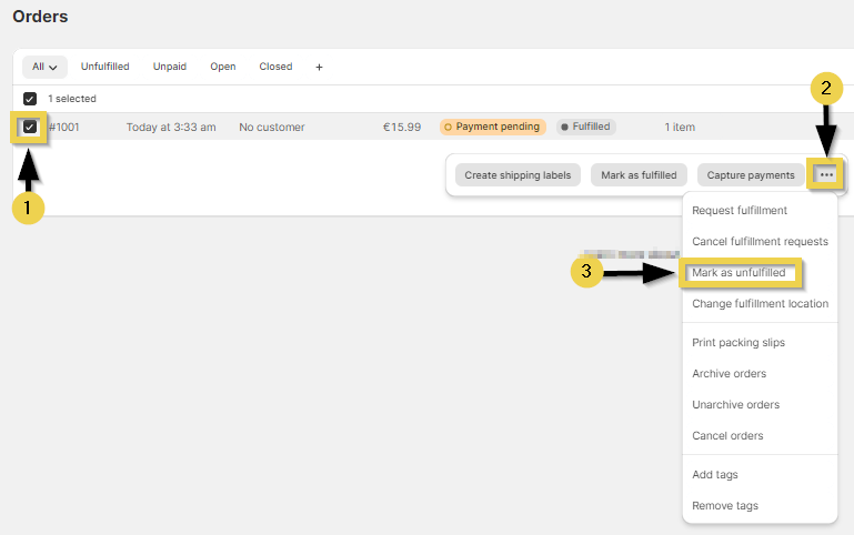Go to the orders, click on the box to the left of the order that you want to change (1). Click on the three dots on the right (2) and select Mark as unfulfilled (3)