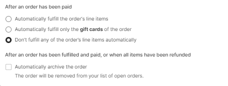 Firstly, select the option “Don’t fulfill any of the order’s line items automatically”. And secondly, the option “Automatically archive the order” should be left unselected.