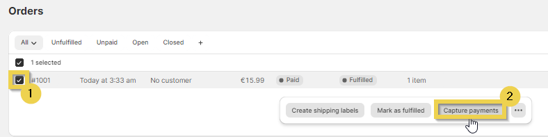When an order has an Authorised payment, but this is not captured, you need to select the order (1) and click on the Capture payment button so that the Multi-Channel Integration Platform can process it.
