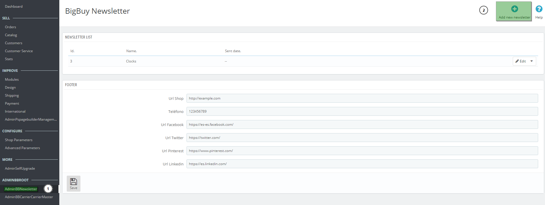 - First go to AdminBBNewsletter (1), and click the “Add new newsletter” button (2).