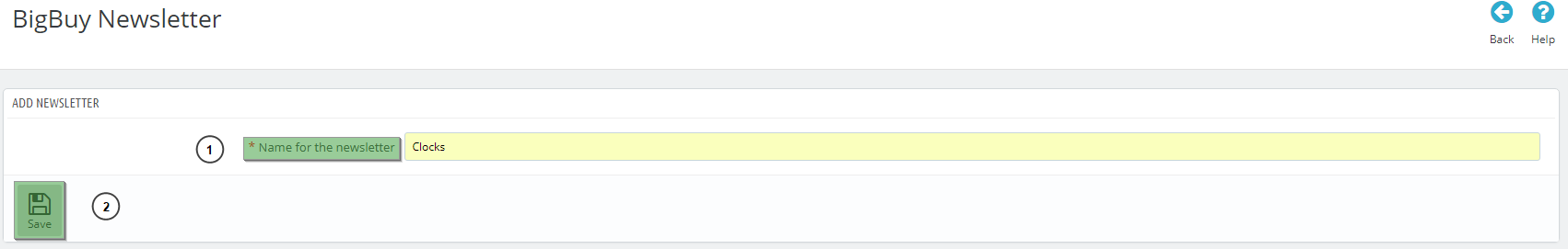 - Enter the name of the newsletter in the “Name for the newsletter” section (1), and click the “Save” button (2).
