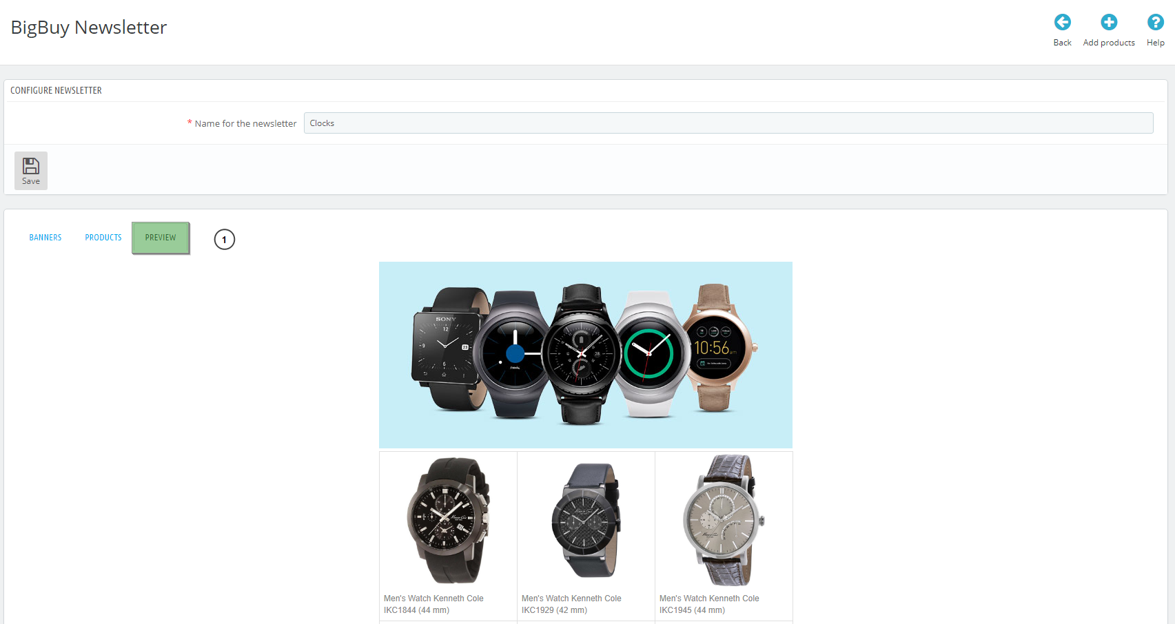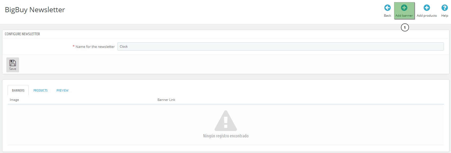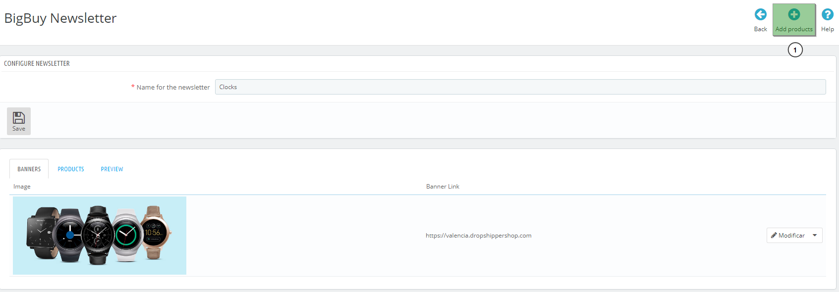 - Once you have selected the banner of our newsletter, click the “Add products” button (1) to add the products you want.