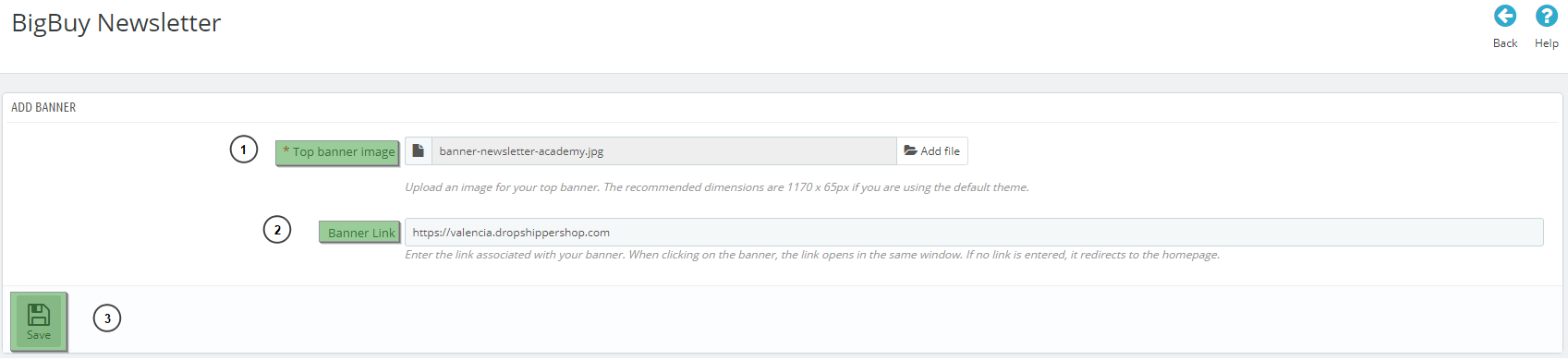 - Add the desired banner by clicking the “Add file” button (1). Insert the banner link (2) and press the “Save” button to save the changes.