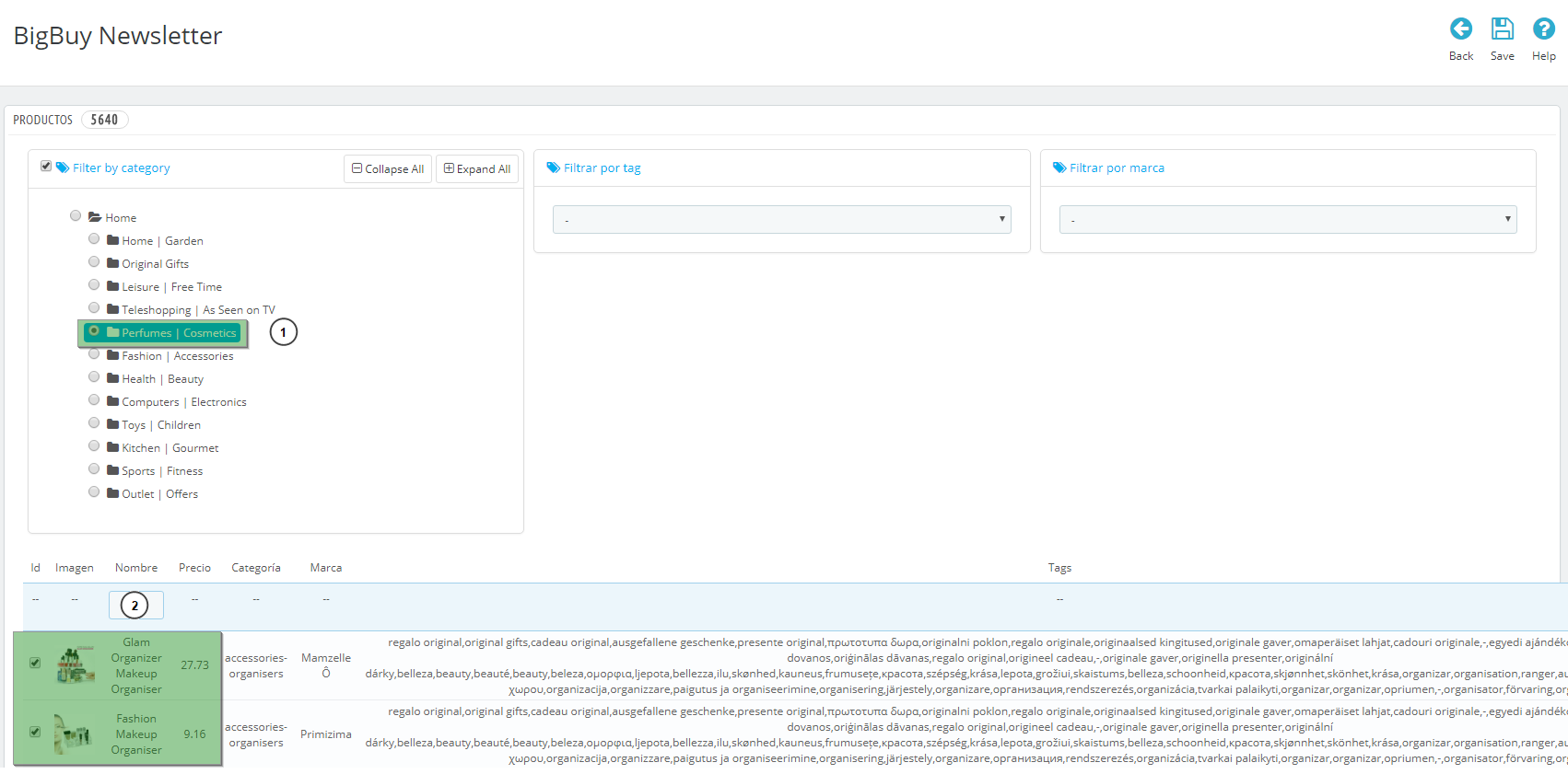 - Select a specific category (1), and once the associated products have been loaded choose the desired products (2). Press the “Save” button.