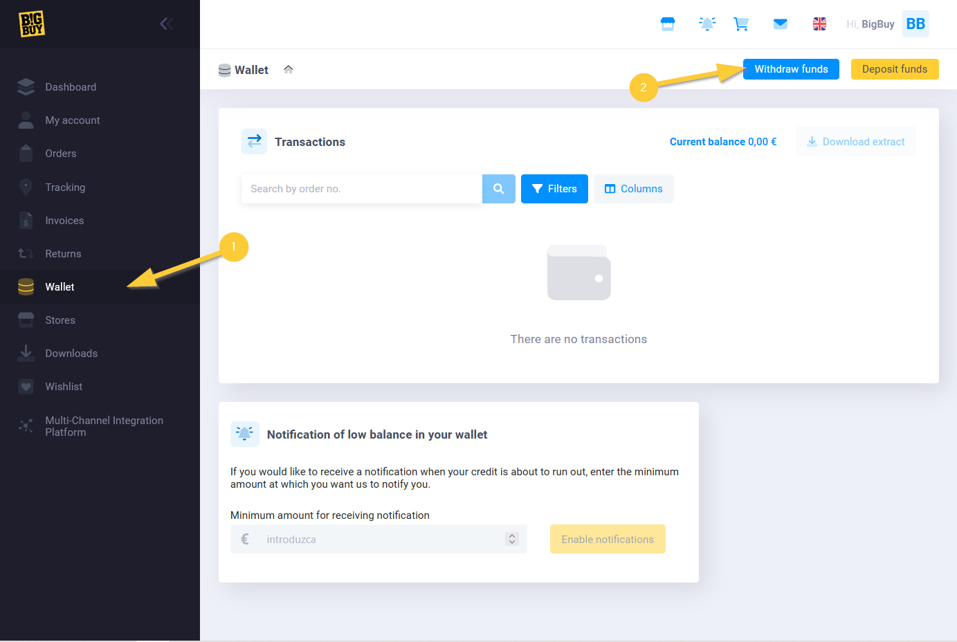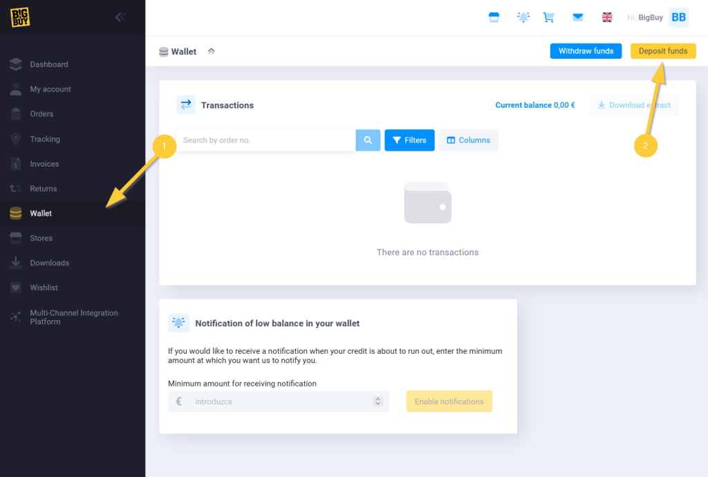 In the Control Panel of your account, BigBuy provides you with the Wallet, which you can recharge to have credit for your orders. It’s a balance that you can recharge via bank transfer, credit card, or also through dropshipping refunds.