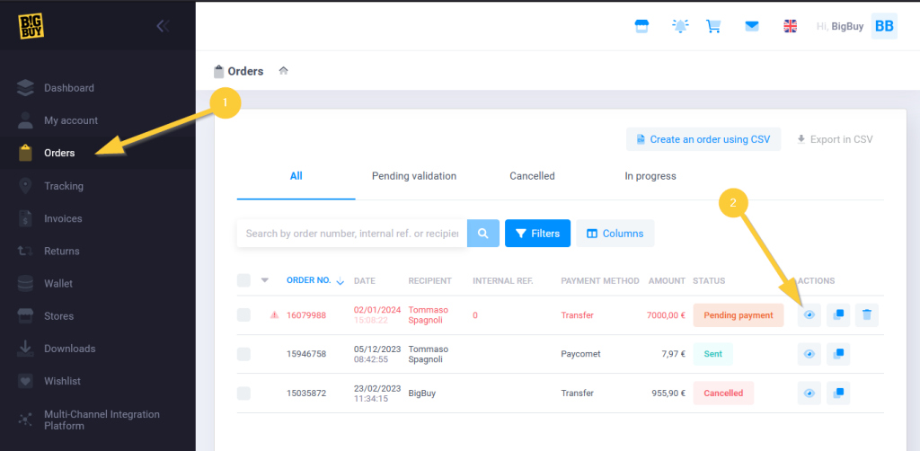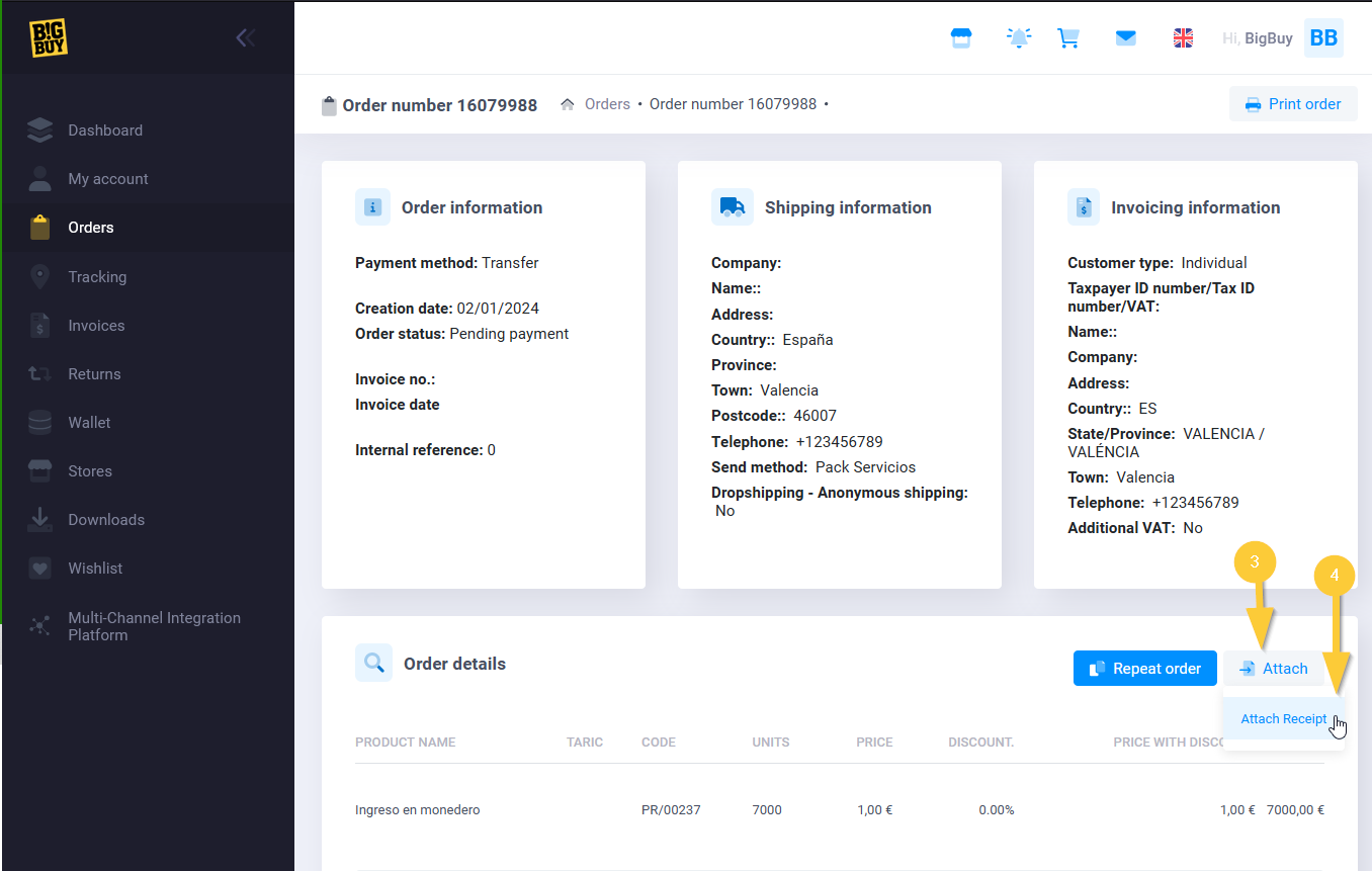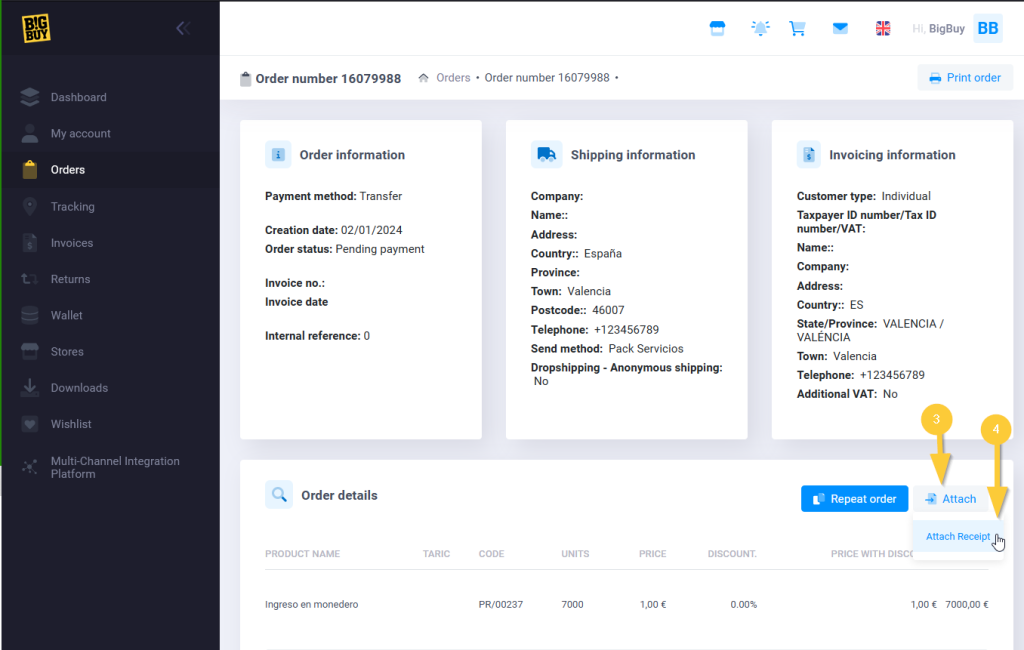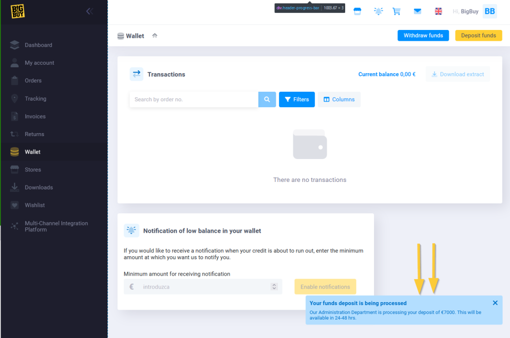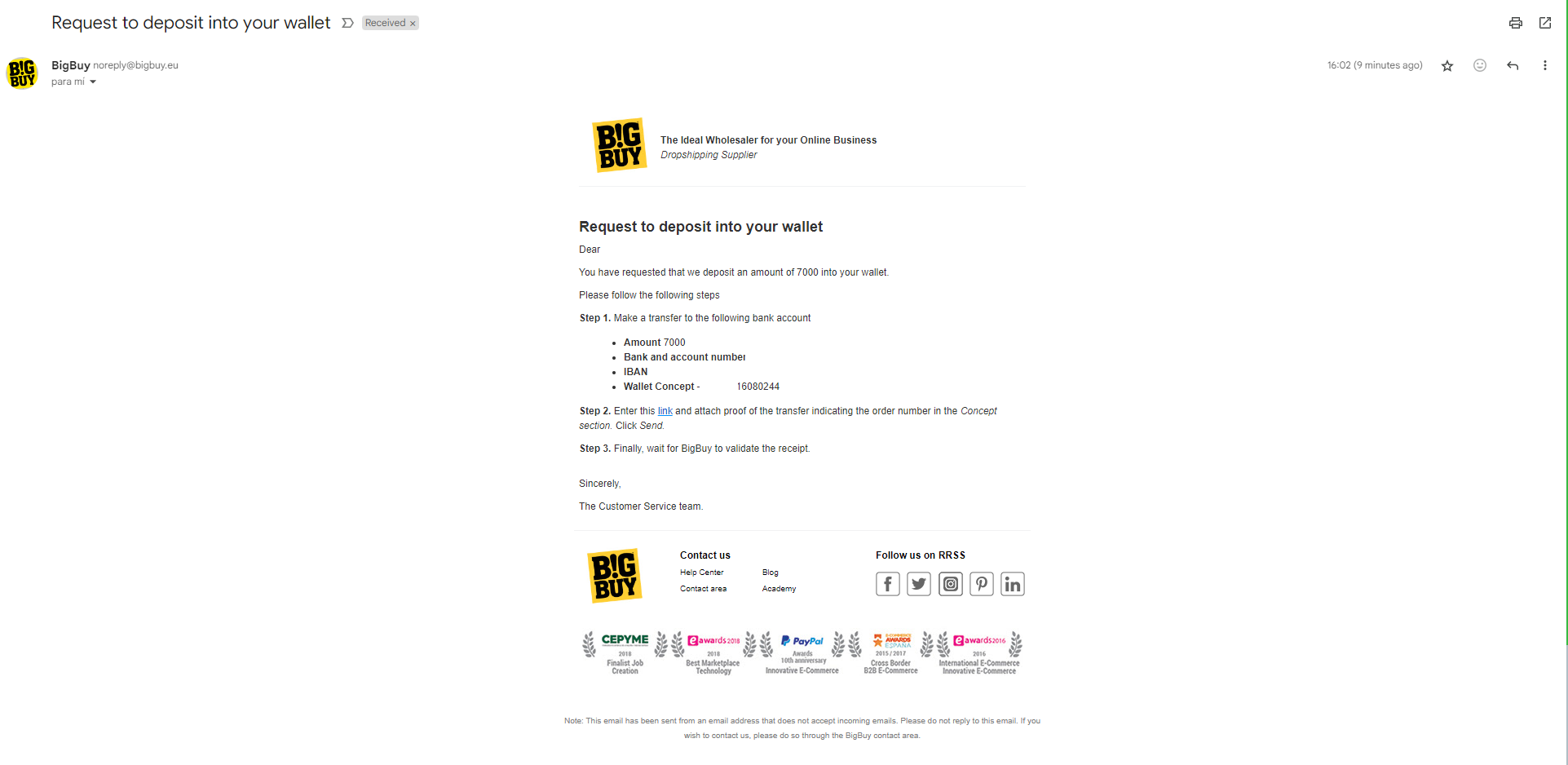 Once done, you’ll have made the recharge request on your BigBuy account’s wallet.