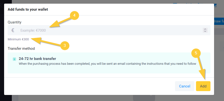 3. To select the amount to deposit, you must enter it in the corresponding field (4). You must deposit at least €300, as indicated in the image (3).
