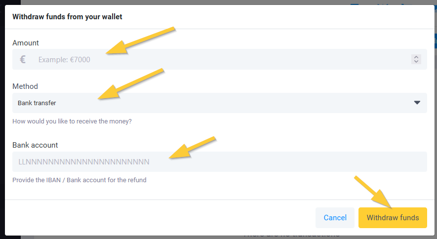 - To speed up the process, make sure that the account selected for withdrawal by bank transfer is the same one you used to recharge your wallet.