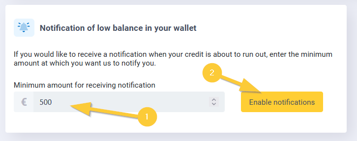 This feature allows you to receive a notification when your credit is about to run out. To activate it, simply indicate the minimum amount (1) at which you want to be notified and click on Enable Notifications (2).