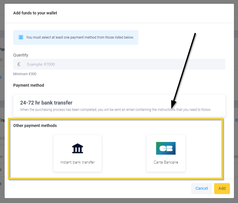 2. Select the Wallet option (1) > Add funds (2) > Bank transfer.