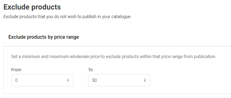 1. Exclusion by price range: This tool affects all selected categories and brands but not the products included by SKU. Let’s say we choose the category “perfumes,” the brand “InnovaGoods,” and 5 sneakers by reference number. If we exclude prices from 0 to 50 euros, we will see all perfumes and InnovaGoods products priced over 50 euros, as well as all sneakers, regardless of their price.