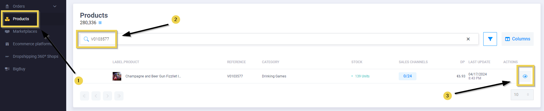 Once successfully published, we can review the status of the products in the “Products” section by entering the SKU/reference number of each item for which we need more information.
