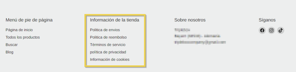 Una vez haya configurado las políticas de privacidad de su tienda, sus clientes podrán acceder a ellas pulsando en los enlaces que se encuentran en Información sobre su tienda.