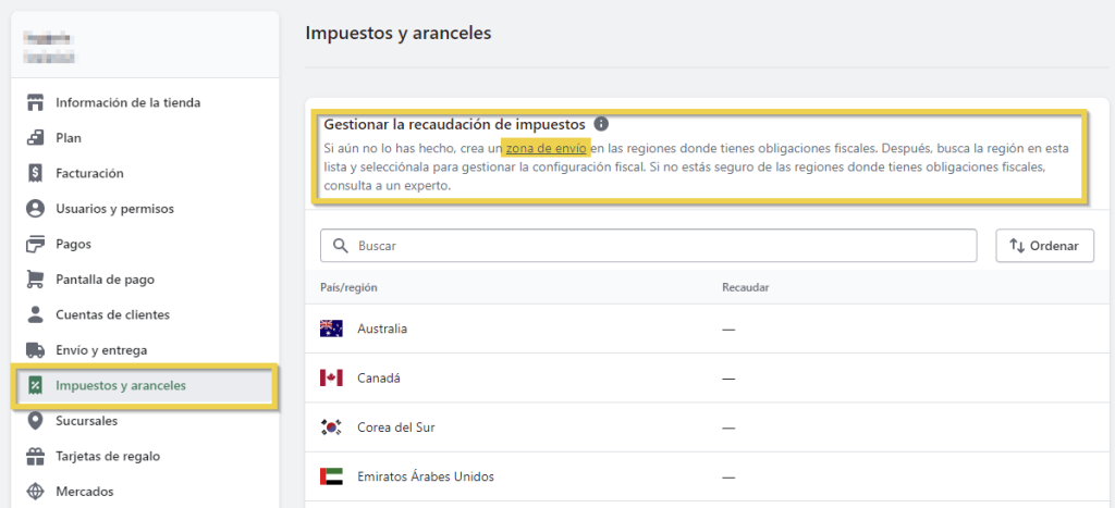- Una vez haya creado las zonas, vaya a la sección Impuestos y aranceles del menú de la izquierda.