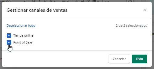 Al hacer clic en Gestionar, se le presentarán los canales de venta disponibles; desmarque aquellos de los que quiera ocultar la colección, de manera que no sea visible.
