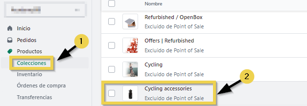En el panel de control de Shopify, haga clic en Colecciones, dentro de Productos, y seleccione la colección que desea gestionar.