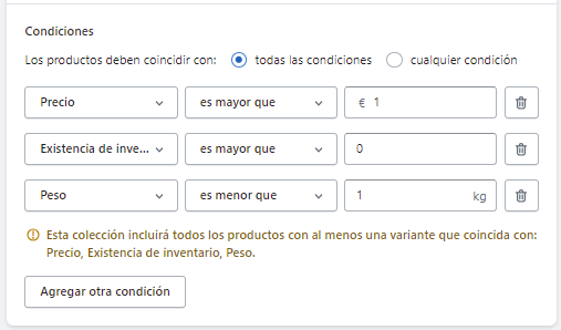 Si opta por una colección automatizada, tendrá que establecer criterios de filtrado para que Shopify seleccione automáticamente los productos que cumplan con esos requisitos. Puede configurar hasta 60 condiciones según categorías, etiquetas, precios, disponibilidad y otros atributos.