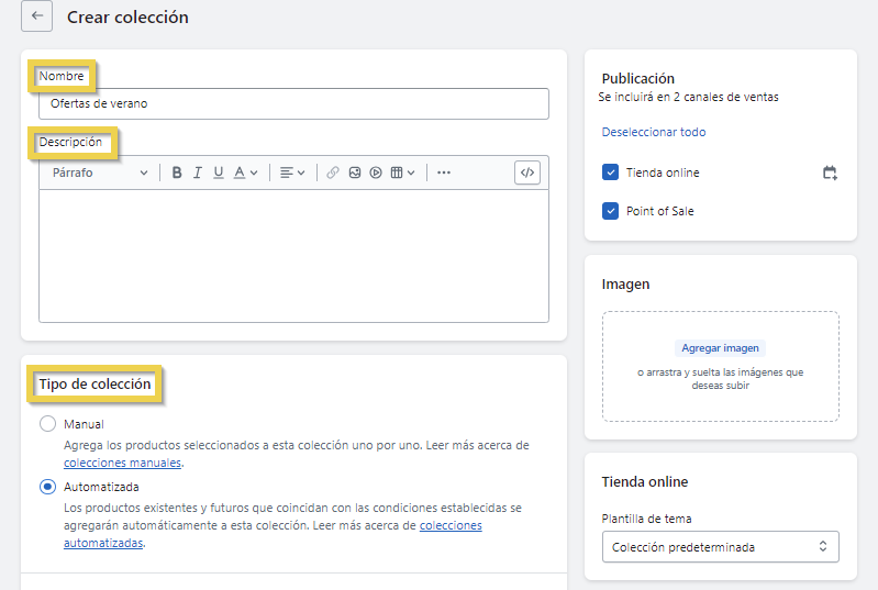 - Tipo de colección: Elija entre Manual o Automatizada, según tus necesidades y preferencias.