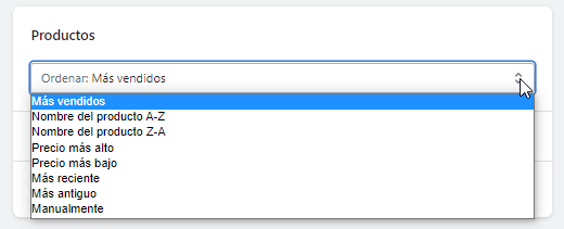 Tanto en las colecciones manuales como en las colecciones automatizadas, existe la posibilidad de ordenar los productos como prefiera, para personalizar aún más sus colecciones, destacar algunos productos y ofrecer a sus clientes una mejor experiencia de compra.