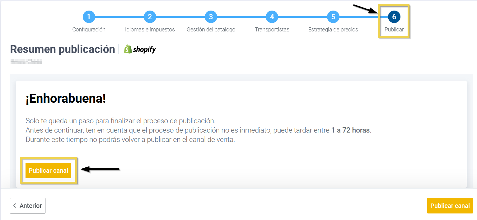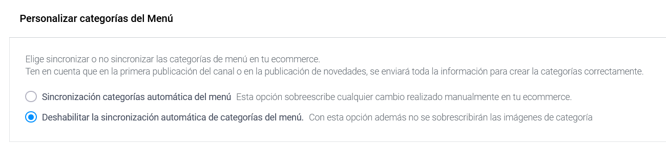 Antes de crear una nueva colección en Shopify, es importante activar la opción Personalizar categorías del menú (dentro de Configuración adicional en Gestión del catálogo) en el Multichannel y realizar una nueva publicación.