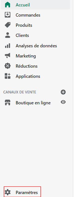 Pour vérifier le domaine qui est actuellement configuré dans votre boutique Shopify et modifier ses paramètres, vous devez accéder à la section « Paramètres » située dans le menu de gauche en bas de l’ensemble