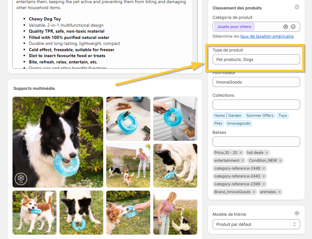 Type de produit : Les types de produits ne sont pas obligatoires, mais ils sont utiles pour étiqueter et catégoriser les produits. Il ne peut y avoir qu’un seul type de produit par produit.