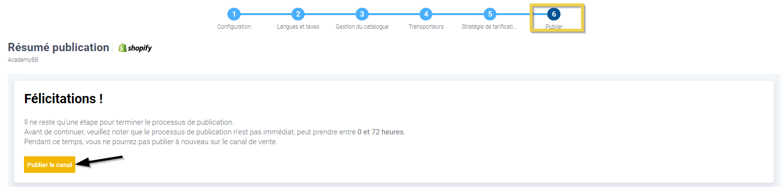 - Une fois la référence introduite, accédez à l’étape Publier et cliquez sur le bouton Publier le canal.