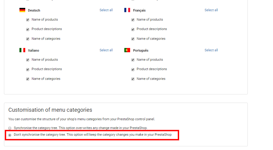En sélectionnant cette option et en terminant la publication du canal de la boutique, l’arborescence des catégories ne sera pas synchronisée et le changement de catégories que vous ferez sur votre PrestaShop sera respecté. De cette manière, vous serez en mesure de modifier le statut des catégories comme souhaité.