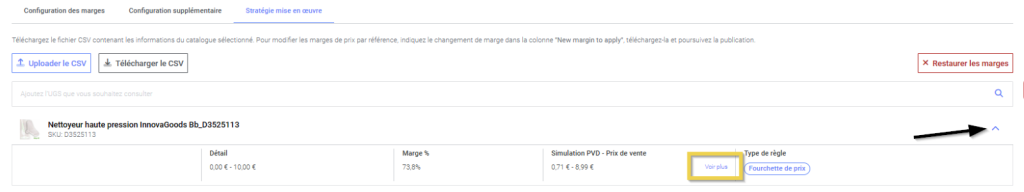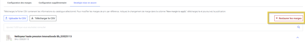 Si vous souhaitez commencer à configurer votre stratégie de tarification à partir de 0, vous pouvez restaurer et supprimer les marges de prix appliquées dans la configuration supplémentaire et pour les produits dont vous avez personnalisé la marge dans cet onglet Stratégie mise en œuvre en cliquant sur Restaurer les marges.