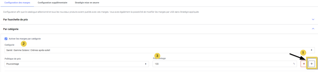 Vous pourrez sélectionner la catégorie de dernier niveau à laquelle appliquer un pourcentage de marge différent de celui de la règle de tarification par fourchette.