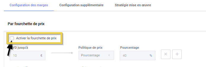 Vous pouvez définir le pourcentage de marge pour les produits situés dans une certaine fourchette.