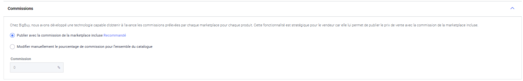 Si vous activez l’option recommandée, la technologie développée par BigBuy nous envoie au préalable la commission prélevée par le marketplace, afin que nous puissions publier le prix de vente avec la commission correspondante incluse.