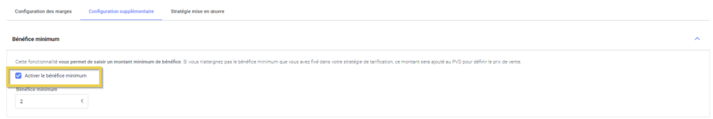 L’option suivante vous permet d’établir un bénéfice minimum de sécurité pour toutes les ventes que vous réaliserez. Si vous indiquez, par exemple, « 2 », le système fixera des prix pour lesquels le bénéfice minimum sera toujours de 2 €.