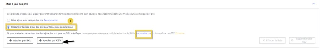 Cette fonction vous permet d’empêcher la synchronisation des prix de certains produits dans votre canal de vente. Vous éviterez ainsi que Bigbuy ne mette à jour les prix de ces produits et n’écrase les prix que vous avez configurés dans votre canal de vente.
