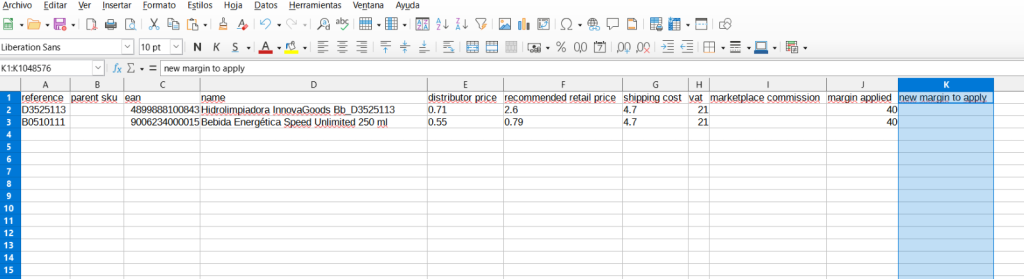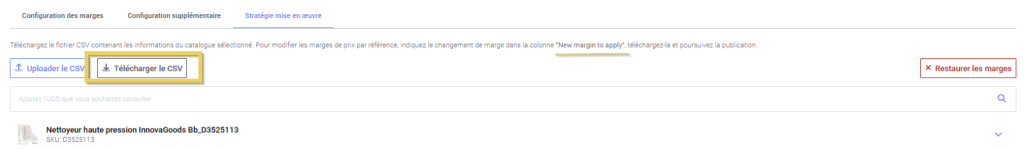 Toutefois, si vous souhaitez définir un pourcentage de marge pour des références spécifiques, vous pouvez ajuster la marge souhaitée en téléchargeant le CSV et en modifiant la colonne “New margin to apply”, puis en chargeant à nouveau le fichier édité.