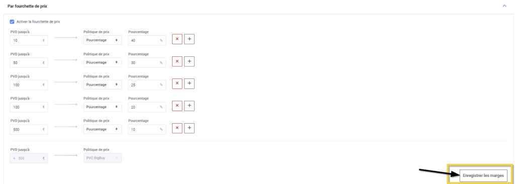 Veuillez noter que si vous n’activez pas l’option Activer la fourchette de prix, c’est le prix de vente recommandé (PVD) de BigBuy qui sera appliqué, car il sera appliqué à partir de la dernière fourchette définie.