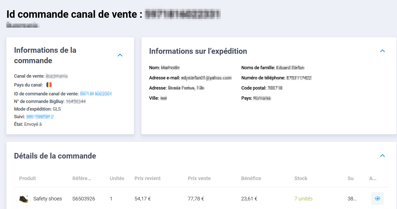 Sur cette fiche, vous pourrez voir toutes les données de la commande. L’une d’elles est l’avis informant que la commande est envoyée.
