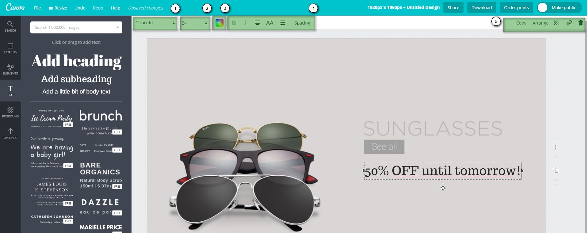 Dans cet exemple, nous avons fait glisser le message « Add subheading » jusqu’à l’image, mais nous pourrions faire glisser l’option qui répond au mieux à nos attentes. Une fois dans la toile, nous pouvons changer la police (1), la taille (2), la couleur (3), le format (4)… On peut aussi dupliquer cette phrase, baisser l’opacité ou l’effacer (5).